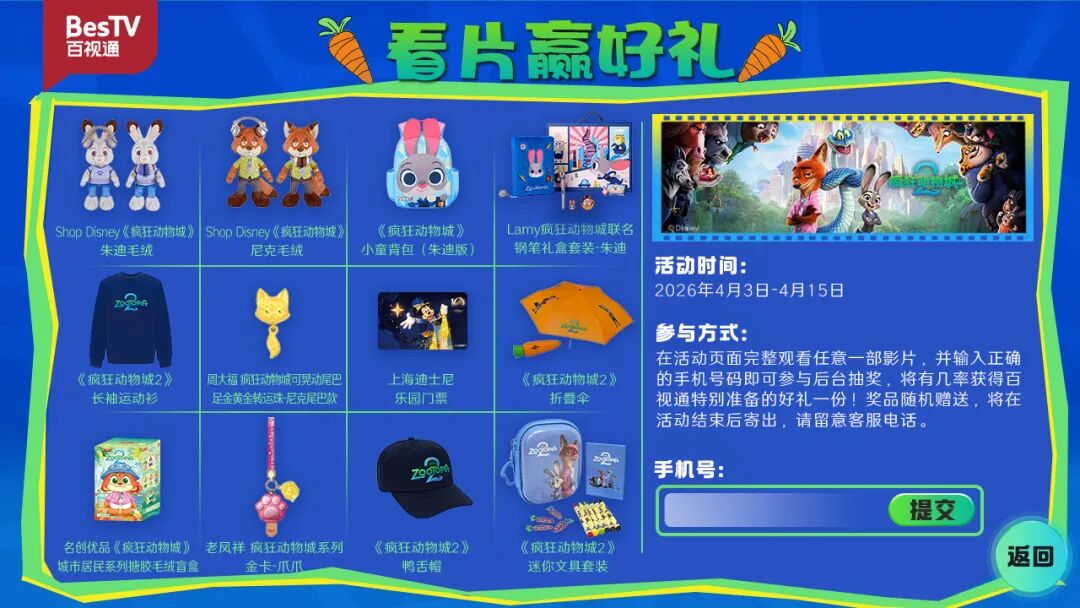 迪士尼爆款动画电影《疯狂动物城2》现已正式登陆百视通IPTV、互联网电视及有线电视大屏平台。平台同步推出专属专题页面,并开启“看片赢好礼”互动活动,诚邀观众跟随朱迪与尼克,再度探索这座充满惊喜的奇迹之城!