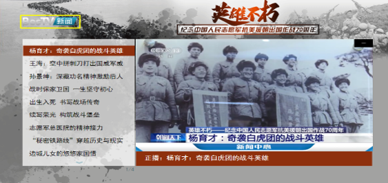 百视通从8月初暑期爱国教育阶段开始,就持续更新爱国主义题材节目,并将延续至10月底,形成了长达三个月的主题宣传期。平台以丰富多元的题材和内容,向用户淋漓展现中国人民志愿军战士的英雄故事和伟大精神。