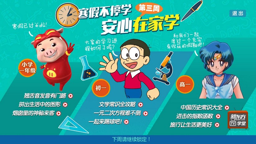 百视通“百视教育”和文广互动“文广学堂”两大大屏在线课程品牌携手新东方、学而思、立思辰、华师慕课、朵拉、巧虎等20余家国内知名教育品牌,特别针对0至18岁全年龄段的寒假荧屏生活,策划“学习不懈怠”“好习惯养成”“快乐玩中学”三大主题课程,为广大中小学生提供一个全方位、寓教于乐的电视大屏平台。