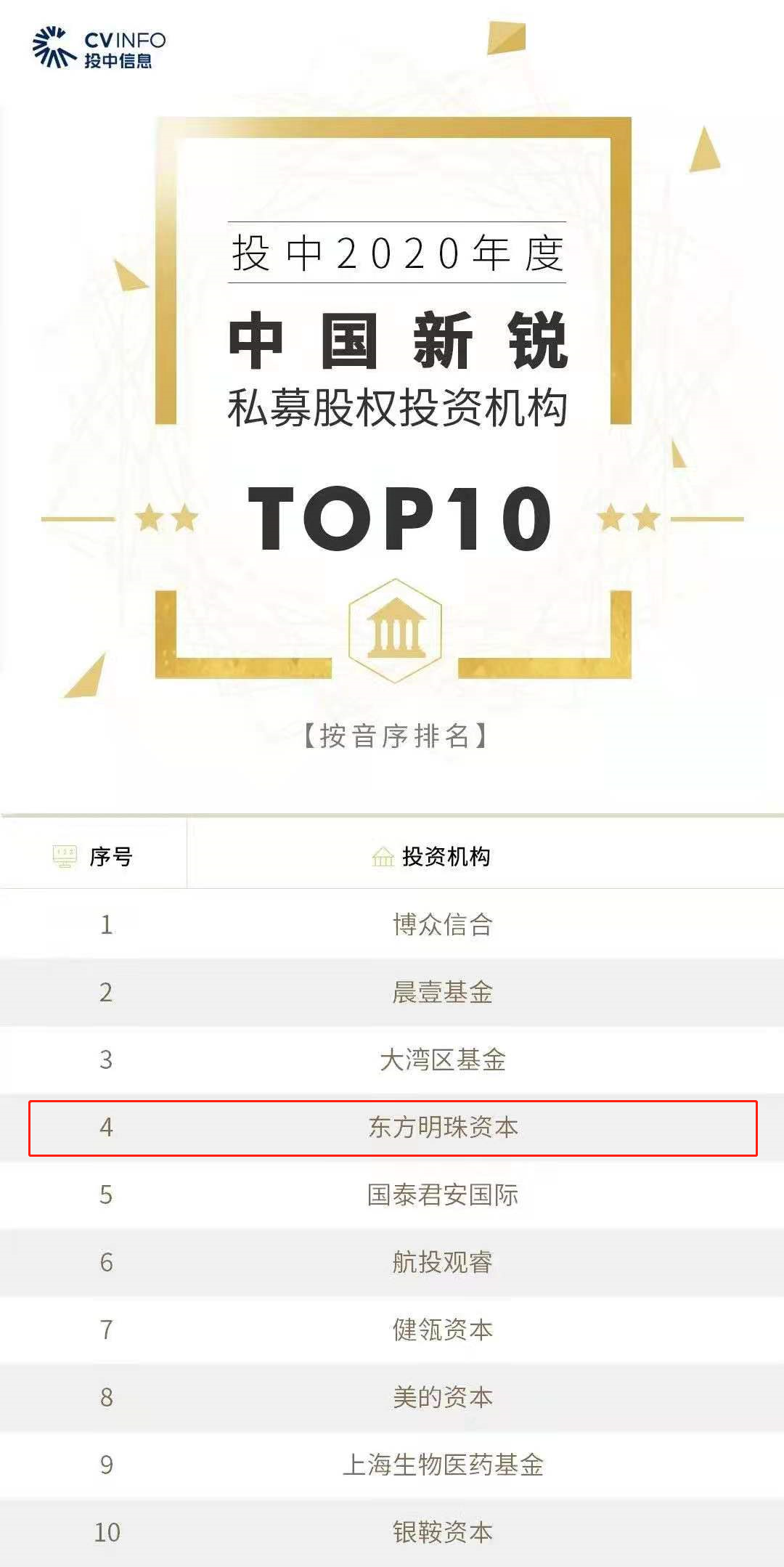 5月13日,中国私募股权行业最权威榜单之一“投中榜”——投中2020年度中国创业投资暨私募股权投资机构榜在上海揭晓,东方明珠新媒体股份有限公司(东方明珠新媒体)旗下东方明珠传媒产业基金(东方明珠资本)荣膺投中2020年度中国新锐私募股权投资机构TOP10。
