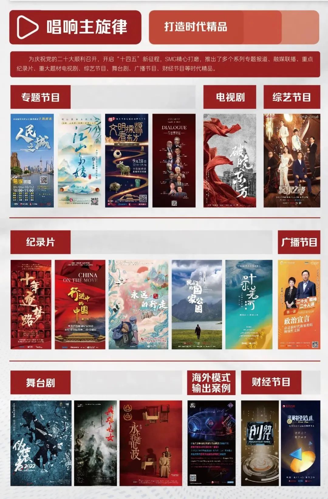 具体包括:专题节目《“人民之城”》融媒体联播、《江山多娇——探访国家文化公园》融媒报道、《“最早的中国·文明之美看东方”》直播特别报道、《与世界对话——引领未来的中国智慧》系列访谈;纪录片《十年逐梦路》《行进中的中国》等;重大革命题材剧《破晓东方》;全国首档全产业链音乐剧文化推广节目《爱乐之都》;海外模式输出案例《我们的歌》;音乐剧《伪装者》《永不消逝的电波》、话剧《英雄儿女》;广播节目《二十大精神二十人讲》;财经节目《来点财经范儿》等。