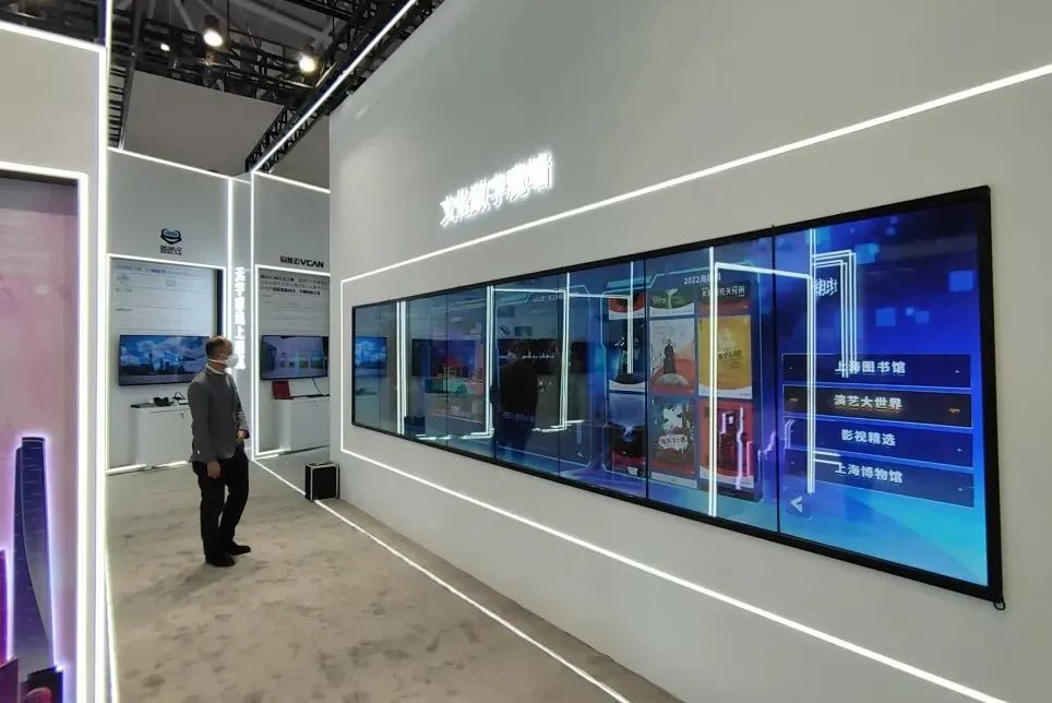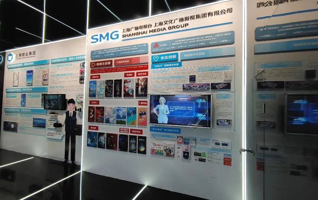 在上海文广集团展示区的巨幅可触控魔屏,展示了SMG近年优秀影视剧《功勋》《光荣与梦想》《大江大河》《大江大河2》《在一起》《两个人的世界》等。