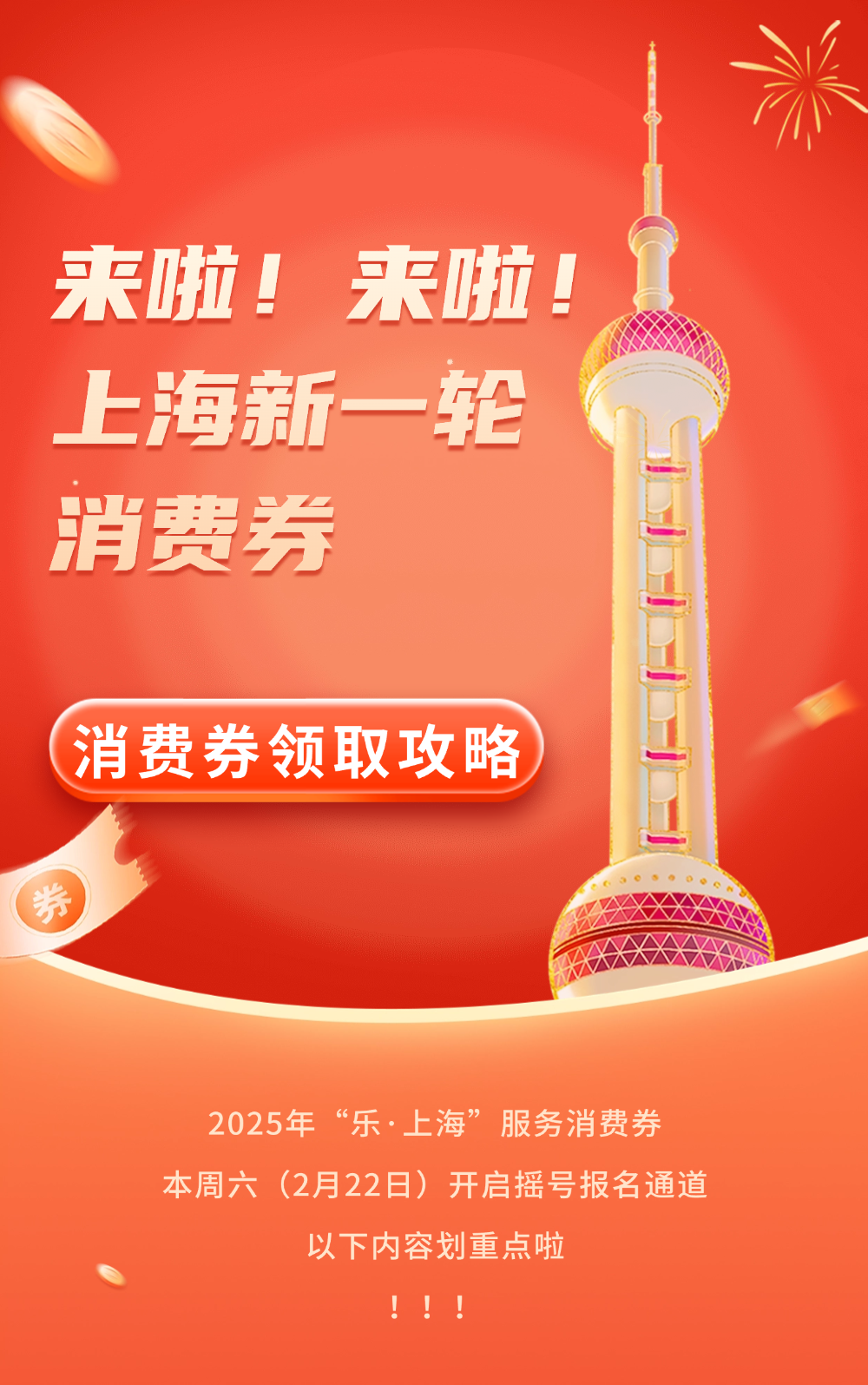 宝子们!好消息来啦!2025 “乐游上海” 旅游消费券和 “乐品上海” 餐饮消费券本周六(2 月 22 日)开启摇号报名通道啦!这可不是一般的消费券,要是幸运摇到,在上海地标东方明珠塔就能用!不管是买东方明珠塔门票、游船游览项目,还是在东方明珠欢乐餐厅、老上海 8 号餐厅用餐,都能享受实实在在的满减优惠。满 30 元减 15 元、满 500 元减 180 元…… 各种面额超划算!快来看看怎样报名,说不定下一个拿着消费券畅玩东方明珠塔的幸运儿就是你!